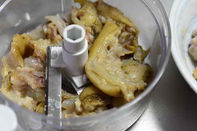 肉糜拌稠之后,再连汤带水倒入煮好剁碎的猪蹄(差点失败,发现猪蹄用粉碎机剁得不够碎不均匀,返工挑出来再人工重剁了一次,图省事不行啊)。