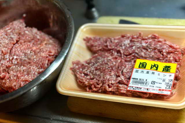 猪肉糜,当然是自己剁最好了,但是我这儿有邻居,不能大刀向鬼子们的头上砍去,所以是买的现成的。