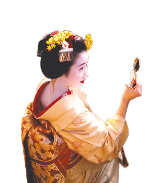 仔细端详橘子的妆容,虽然脸部都是白的,眼角却被点上红色,而手上则什么妆都没有。一位年龄大些的艺伎说,那点红色没有特别意义,只是让女性更加妩媚。一旁的舞蹈老师补充说,艺伎脸部之所以涂得非常白,是因为过去没有电灯,都是蜡烛,只有涂成那样才能使人看上去更漂亮。至于艺伎的手没有涂白,则是为了显示艺伎的清洁,好在提供餐饮服务时让客人放心。