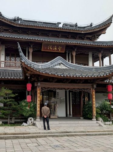 沿着青溪铺就的老街宽三、四米,以青石板铺就,显出一种历史感。街道中央位置上矗立着一座雕梁画栋的巍峨高楼,称作望海楼。望海楼建于民国初年,原称望江楼。望海楼三开间三层,说其巍峨是从建成至今日,它是这方土地最大最高的建筑物。欲登望海楼远眺,看看能否望到江或望到海,可惜它尚未对外开放。倒是我在它前面的溪岸上欣赏到一场音乐会:溪水南岸有座挑檐翘角凉亭,眼见亭内有位身着中式褂子的老人在拉二胡曲调传到岸这边的我耳中,听出的是瞎子阿炳作曲的《二泉映月》。二胡一曲终了,岸这边的我身旁来了位中年绅士,他从小拉车里取出一把萨克斯管和一杆拍视频的手机支架,调好萨克斯管的音调后吹出了一曲《可可托海的牧羊人》。他吹得很棒,不由得引我喉中轻轻哼出了“那夜的雨也没能留住你,山谷的风它陪着我哭泣……”望海楼外,隔着一道青溪的中西音乐合出了和谐的乐章……