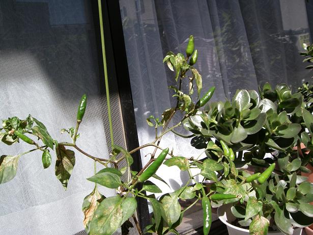 又是死而复活的一棵苗,叶都枯烂了,却长出了朝天的椒(有颗朝地的是蔓儿支持不住了):
